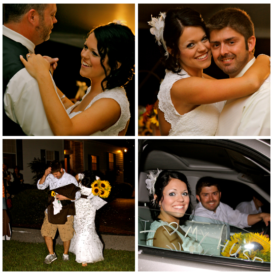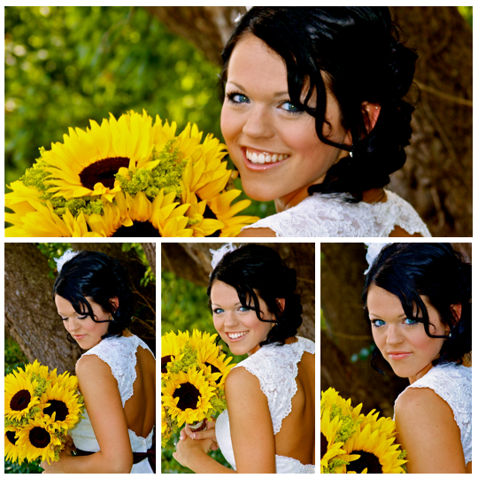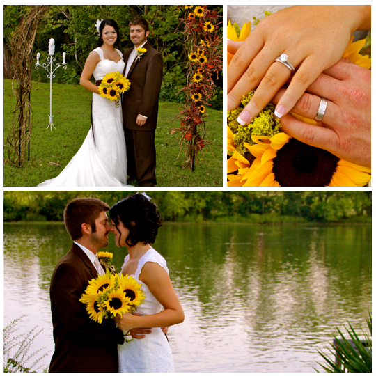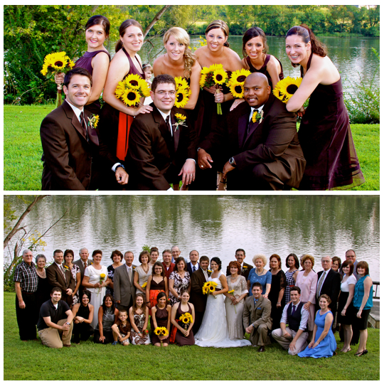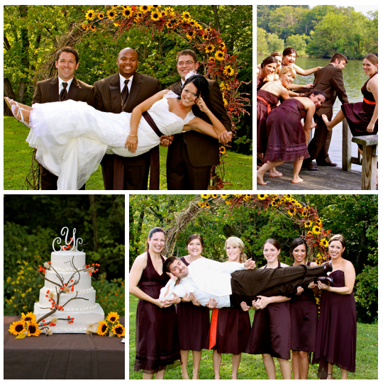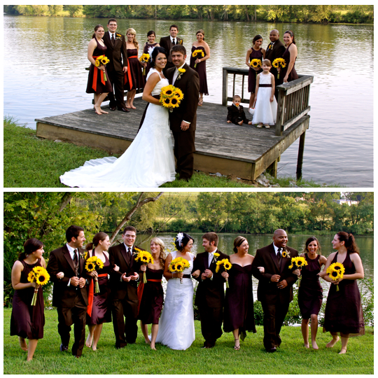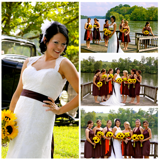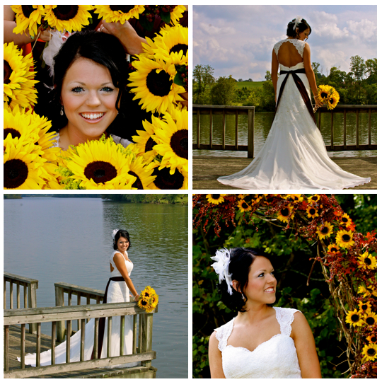 Courtney and Lindsay had an amazing lake wedding. Her theme was fall and autumn decorations. She had sandwiches made out of leaf cutouts, pumpkins all over the place, and her bouquet was made out of sunflowers.